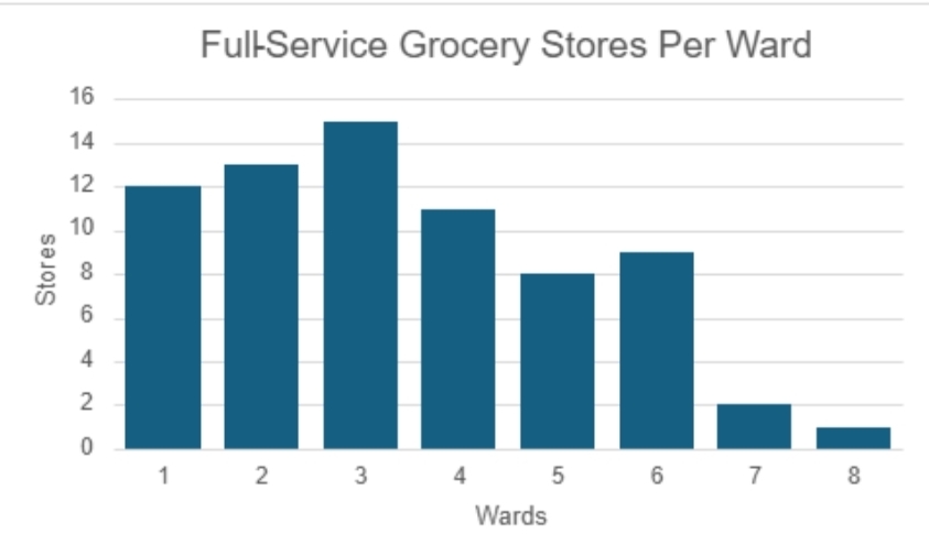those without a car, it can be much more challenging. Former resident December Hamlet states, “When I stayed in Ward 8, there were limited grocery options unless you drove. Otherwise, you’re taking a minimum 30-minute metro commute to get fresh groceries. The grocery store food options are limited as well. Stores tend to be neglected a lot more. I literally used to go from SE to NE to get better options and shop in a cleaner environment.”